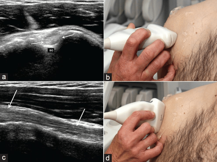 La ecografía del hombro comienza examinando el surco bicipital (BG) y la cabeza larga del tendón del bíceps braquial. El paciente está sentado frente al operador en una posición neutra, su mano colocada con la palma hacia arriba sobre el muslo. Se realiza una imagen de eje corto colocando el transductor sobre la metáfisis humeral proximal perpendicular al húmero. La imagen del eje largo del tendón se obtiene girando el transductor a una posición paralela a la diáfisis humeral [Figura 1]. Luego, se examina el tendón del subescapular. El brazo del paciente se fija sobre el flanco y el antebrazo se abduce en rotación externa. Se realizan vistas de eje largo y corto del tendón [Figura 2]. Los tendones infraespinoso y redondo menor se examinan desde una vista posterior del hombro. El paciente se gira 90°, su mano se coloca sobre el hombro opuesto y el transductor se orienta en el plano axial sobre la cabeza del húmero [Figura 3]. La articulación glenohumeral y la escotadura espinoglenoidea también se examinan en una vista posterior del hombro. El transductor ahora se mueve medial y caudalmente en el plano transversal hasta que se vea el margen posterior de la articulación glenohumeral y luego, más medialmente para mostrar la escotadura espinoglenoidea [Figura 4]. El tendón supraespinoso se escanea en una vista anterior del hombro. El paciente está sentado frente al operador. El brazo del paciente se coloca en una posición posterior, la mano dorsal en el ala ilíaca opuesta o la mano palmar en el ala ilíaca ipsilateral. Se obtienen vistas de eje largo y corto del tendón supraespinoso. Luego se realiza la exploración del manguito de los rotadores durante las maniobras dinámicas. El transductor se coloca sobre el acromion. El brazo del paciente se abduce con el codo flexionado a 90° o/y el brazo se extiende anteriormente [Figura 5]. Finalmente, se escanea la articulación acromioclavicular. La mano del paciente se coloca con la palma hacia arriba sobre el muslo. El transductor se coloca sobre la parte superior del hombro en un plano coronal [Figura 6].