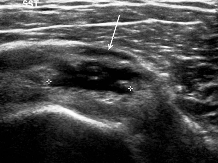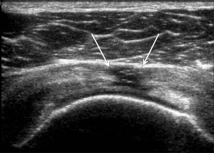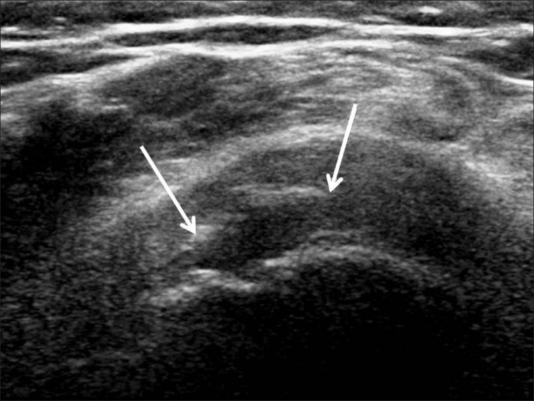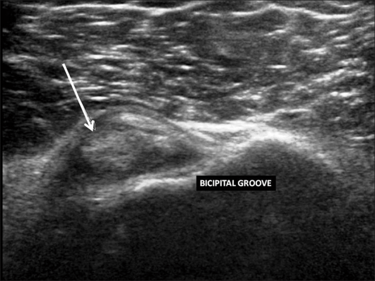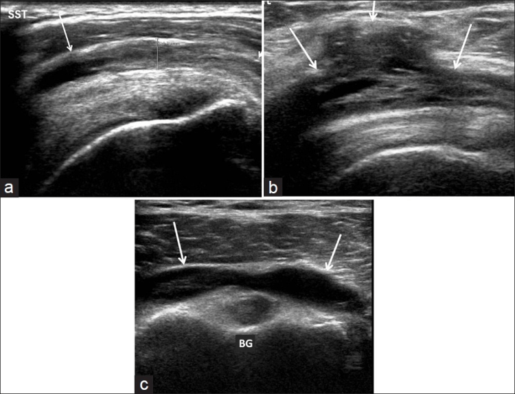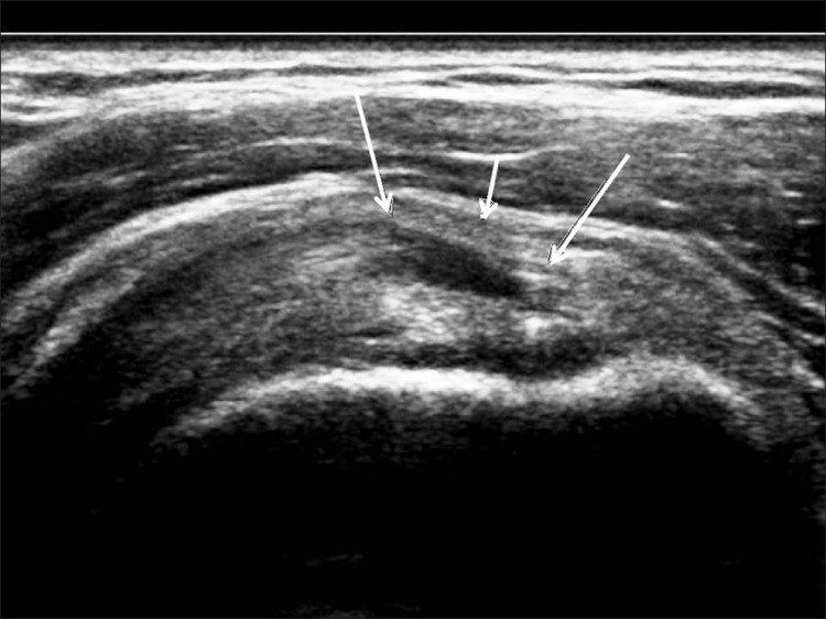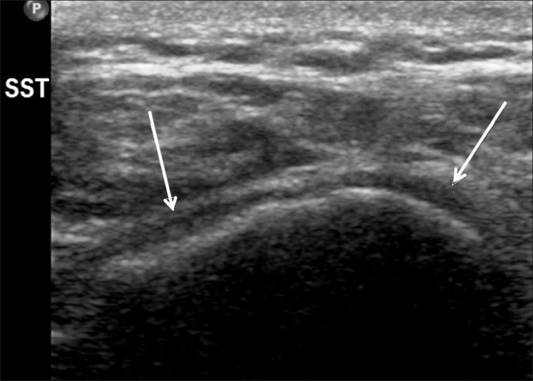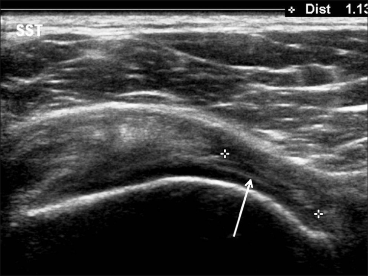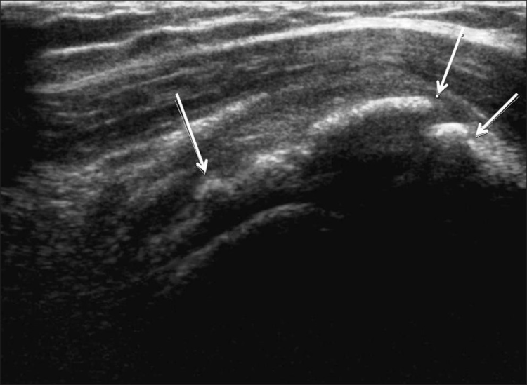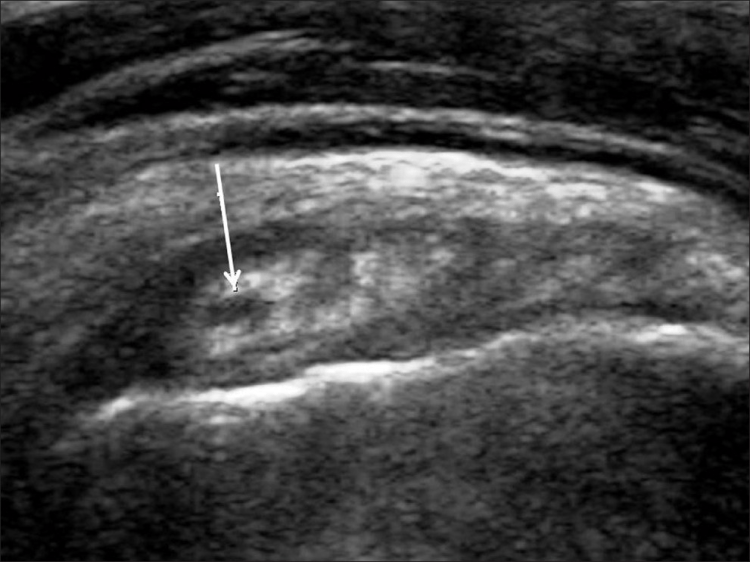 Los desgarros del manguito de los rotadores son la patología más común que se encuentra en los exámenes de ultrasonido del hombro.[7] La incidencia de lágrimas aumenta con la edad. Los desgarros de tendones se pueden clasificar de acuerdo con el grado de falla de la fibra, que van desde desgarros completos [Figura 7], desgarros de espesor total [Figuras 8, 9], desgarros de espesor parcial [Figuras 10-12] y desgarros intrasustancia [Figura 13 ]. Un desgarro agudo suele ir acompañado de derrame articular o bursal [Figura 12]. [7-9] La ausencia de derrame generalmente se relaciona con desgarros crónicos.[9] En un metanálisis sobre la precisión de la resonancia magnética, la artrografía por resonancia magnética y la ecografía en el diagnóstico de desgarros del manguito de los rotadores, la ecografía ofreció una alta sensibilidad y especificidad para la evaluación de los desgarros del manguito de los rotadores de espesor total (92,3 y 94,4 %, respectivamente) con 85,1 % y 92 %, respectivamente para todas las lágrimas.[7] El desgarro de espesor parcial aparece como un defecto o hendidura hipoecogénica en el tendón, afectando solo una parte de su espesor, mientras que un desgarro de espesor total se extiende desde la bolsa hasta la superficie articular del tendón. Un desgarro completo es un desgarro de espesor completo que afecta todo el ancho del tendón. El tendón se retrae medialmente, y la cantidad de retracción depende de la edad del desgarro. En las roturas crónicas, el tendón desaparece por debajo del arco coracoacromial, dejando la cabeza humeral descubierta por el supraespinoso, el denominado signo de la "cabeza desnuda". Los hallazgos de la ecografía incluyen la falta de visualización del tendón y la hernia del músculo deltoides. Los desgarros intrasustancia permanecen localizados en el tendón sin afectar sus márgenes. Los desgarros intrasustancia y de espesor parcial pueden ser difíciles de diferenciar de la tendinopatía focal.