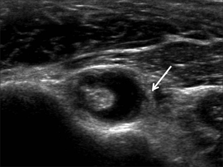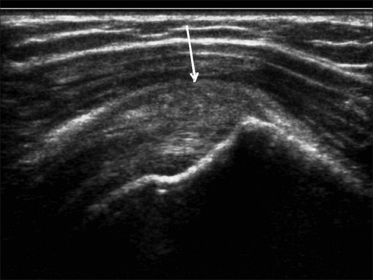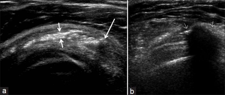 Las patologías no relacionadas con desgarros del manguito rotador que se encuentran con más frecuencia son la tendinosis del manguito rotador [Figura 14], la tendinitis calcificante del manguito rotador [Figura 15] y el pinzamiento del tendón subacromial [Figura 16]. Vale la pena señalar que, en tales casos, se pueden desarrollar desgarros debido a la debilidad del tendón [Tabla 2].[79] La tendinosis o tendinopatía del manguito de los rotadores se presenta como inflamación del tendón con una ecotextura hipoecoica heterogénea del tendón. Las calcificaciones del manguito de los rotadores aparecen como focos hiperecogénicos, ya sea con una sombra posterior bien definida (Tipo I) o con una sombra tenue (Tipo II) o ausente (Tipo III). El Tipo I corresponde a la fase formativa y los Tipos II y III a la fase de reabsorción, en la que cambian a depósitos de calcio semi o totalmente líquidos. En el pinzamiento subacromial, el tendón no se desliza en el espacio subacromial durante la abducción y la elevación anterior del brazo.