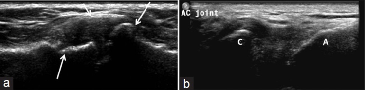 Derrame de la articulación gleno-humeral [Figura 17], derrame de la bursa subacromial-subdeltoidea [Figura 18], bursitis calcificante [Figura 19], artropatías y dislocaciones de la articulación acromioclavicular [Figura 20], rotura del tendón del bíceps [Figura 21], sinovitis [Figura 22] y la luxación [Figura 23] son las principales patologías no relacionadas con el manguito rotador que se observan en la ecografía de hombro [Tabla 3]. [8-9] La ecografía es sensible para la detección de derrame de la articulación glenohumeral y derrame bursal subdeltoideo subacromial, incluso en pequeñas cantidades. La aspiración de líquido bajo guía ecográfica permite un diagnóstico preciso. La penetración intrabursal de depósitos calcificados en el tendón provoca una bursitis microcristalina aguda y dolorosa. La subluxación o dislocación de la articulación acromioclavicular aparece como un ensanchamiento de la cavidad articular y un abultamiento de la cápsula superior y el ligamento. La rotura de la cabeza larga del tendón del bíceps braquial suele generar un bulto en la parte anterior del brazo, conocido como "signo de Popeye". La rotura del tendón suele ocurrir a nivel intrarticular con retracción distal, dejando un surco vacío. En los desgarros agudos, el muñón del tendón aparece rodeado de líquido. La luxación del tendón del bíceps medial se diagnostica con ecografías transversales, que muestran el surco bicipital y el tendón que recubre la tuberosidad menor.#dieciséis#