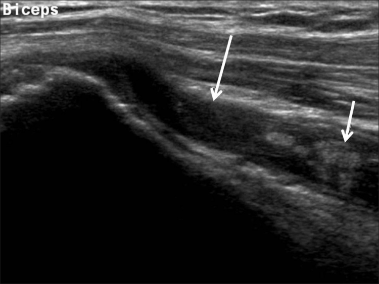 Los tendones se ven como una estructura ecogénica fibrilar fina. Los examinadores deben ser conscientes de la anisotropía, un artefacto común y un peligro potencial en la ecografía de los tendones, que los hace parecer hipoecoicos cuando el ángulo del haz de ultrasonido incidente no es perpendicular al tendón. Este fenómeno se puede evitar asegurándose de que el transductor esté colocado correctamente.[5-6]